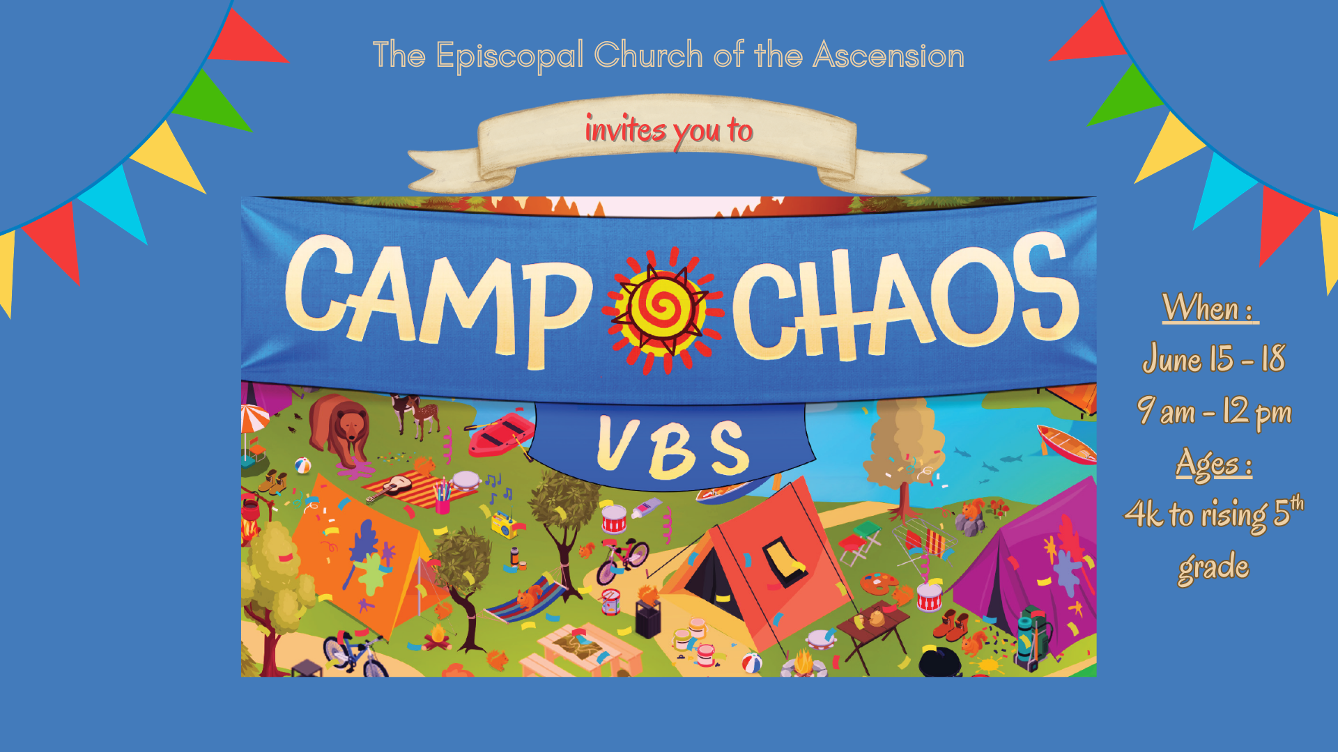 This summer, children will spend a few days at a forest campsite—but watch out! Things are starting to get a little wild at Camp Chaos, but we will discover how Jesus is our peace in a chaotic world. Save the dates for VBS June 15 - 18, ages 4k - rising 5th grade welcome! Questions? Reach out to Ashley Monachelli (ashley.monachelli@ascensionepiscopal.org)
