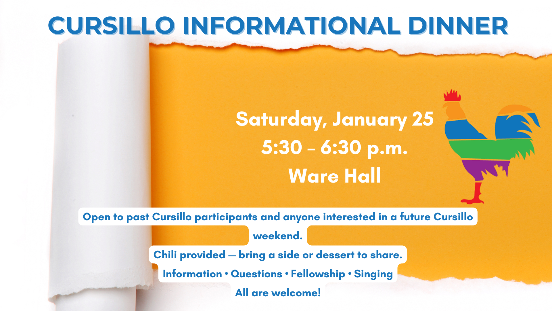 Mary Beth Basu and Rebecca Posey invite you to an informational dinner about Cursillo on Saturday, January 25, from 5:30–6:30 p.m. in Ware Hall. This gathering is open to past Cursillo participants as well as anyone interested in attending a future Cursillo weekend. If you enjoyed the Parish Retreat, you’ll love Cursillo! We’ll share information, answer questions, enjoy fellowship, and of course sing a couple of songs. Chili will be provided, and guests are invited to bring a side dish or dessert to share. All are welcome—come learn more and enjoy a relaxed evening together!