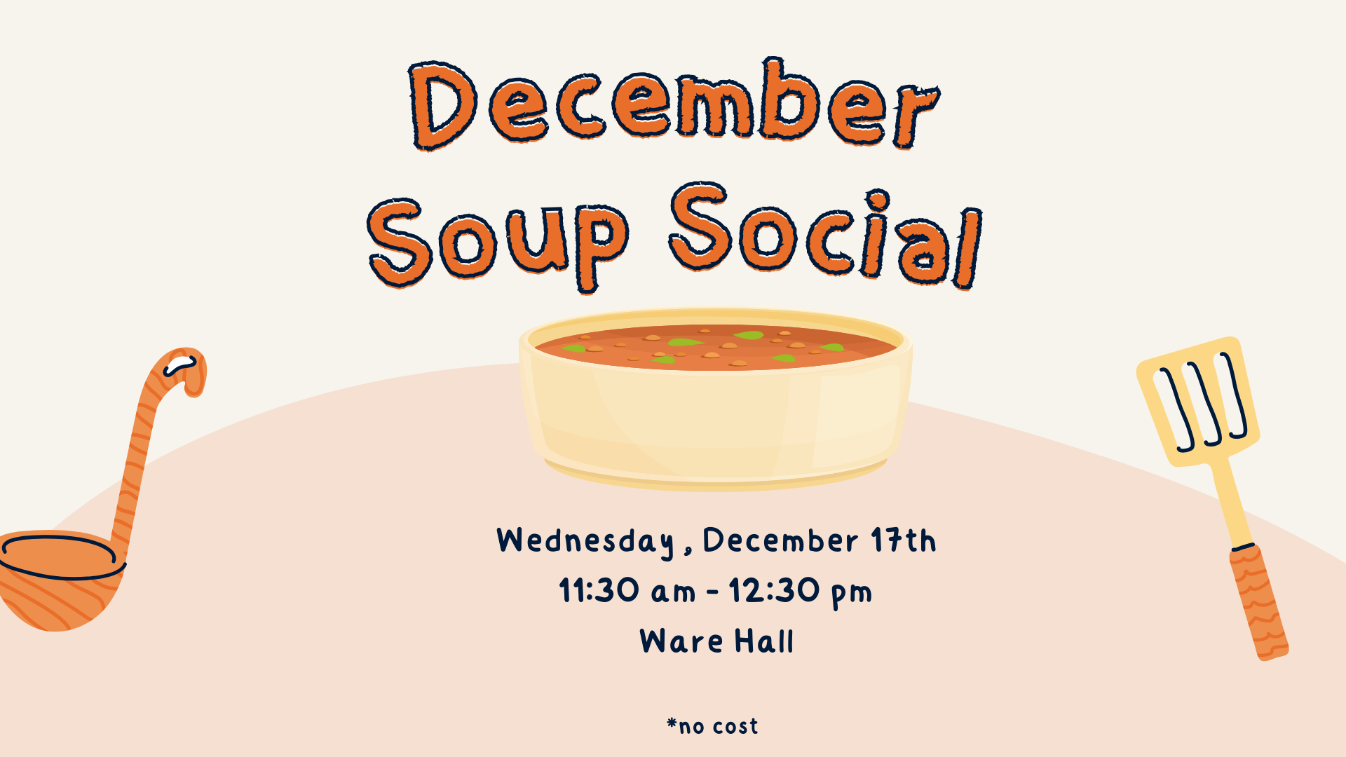 Join us for soup and fellowship, 11:30 a.m.–12:30 p.m. in Ware Hall. No cost—just come and enjoy! This month: Chicken & Corn Chowder as well as Christmas treats!. Contact Kathy Lounsbury at