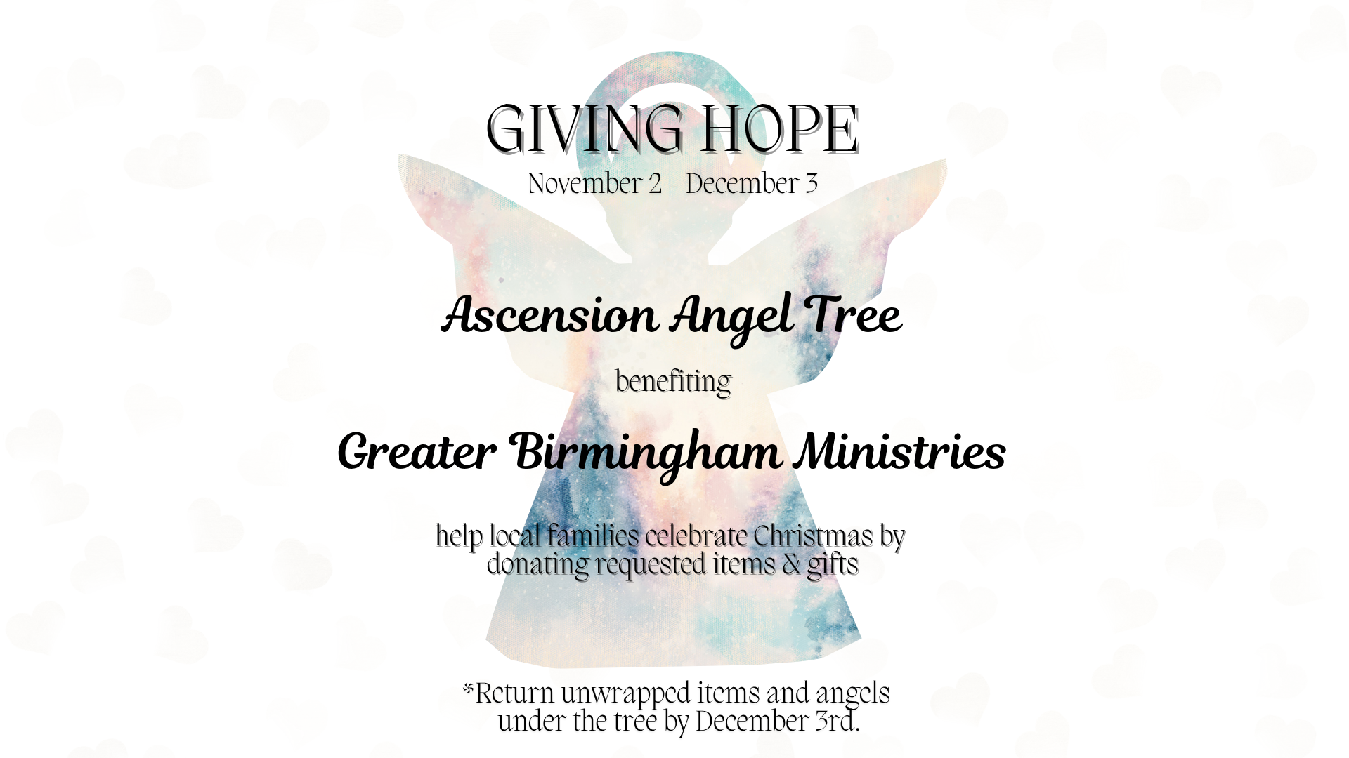 Giving Hope this Holiday Season! Ascension's Angel Tree is back, benefiting families in need through Greater Birmingham Ministries. Help bring joy to local families by donating requested items and gifts.
