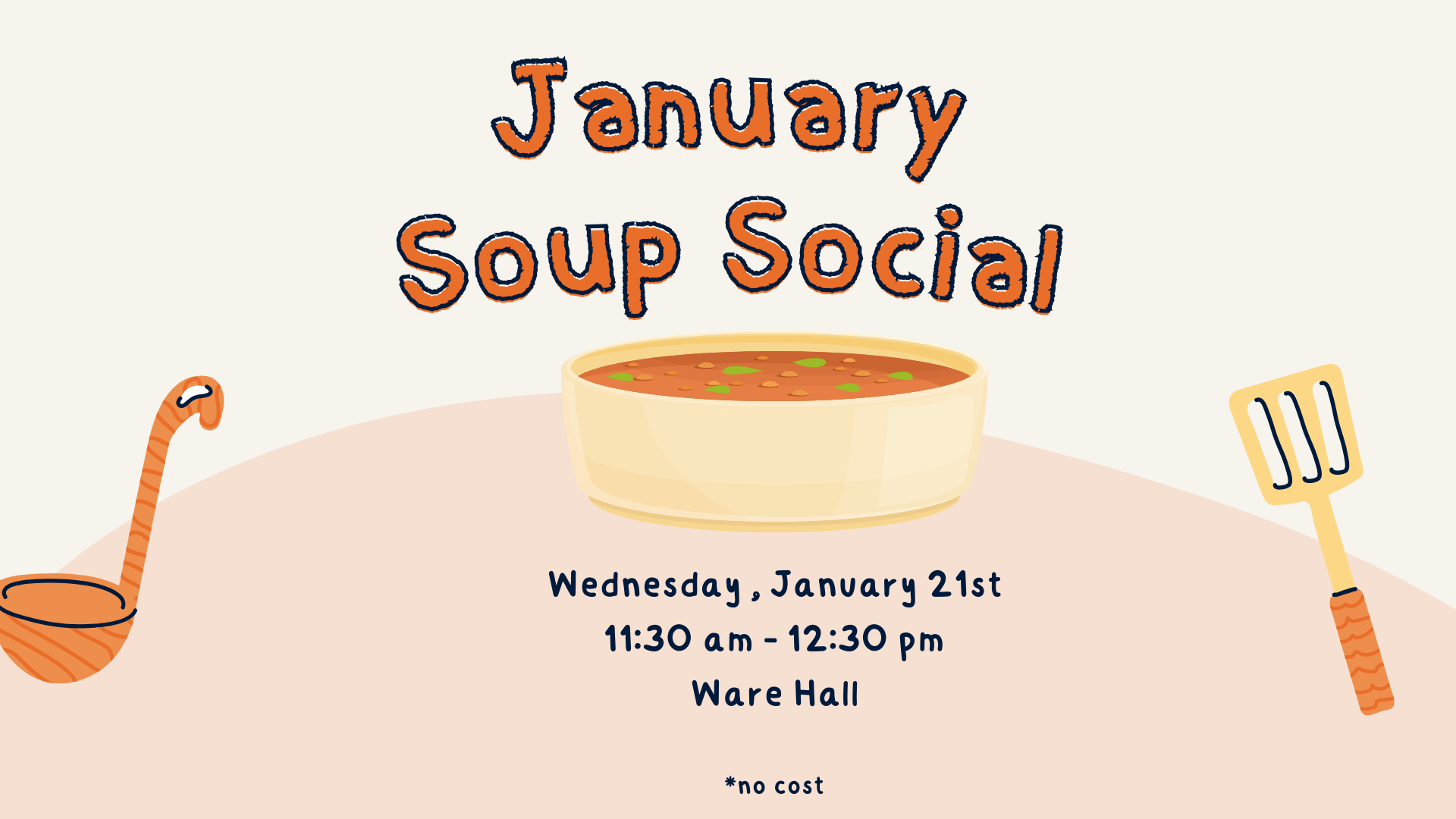 Join us for soup and fellowship, 11:30 a.m.–12:30 p.m. in Ware Hall. No cost—just come and enjoy! Contact Kathy Lounsbury at