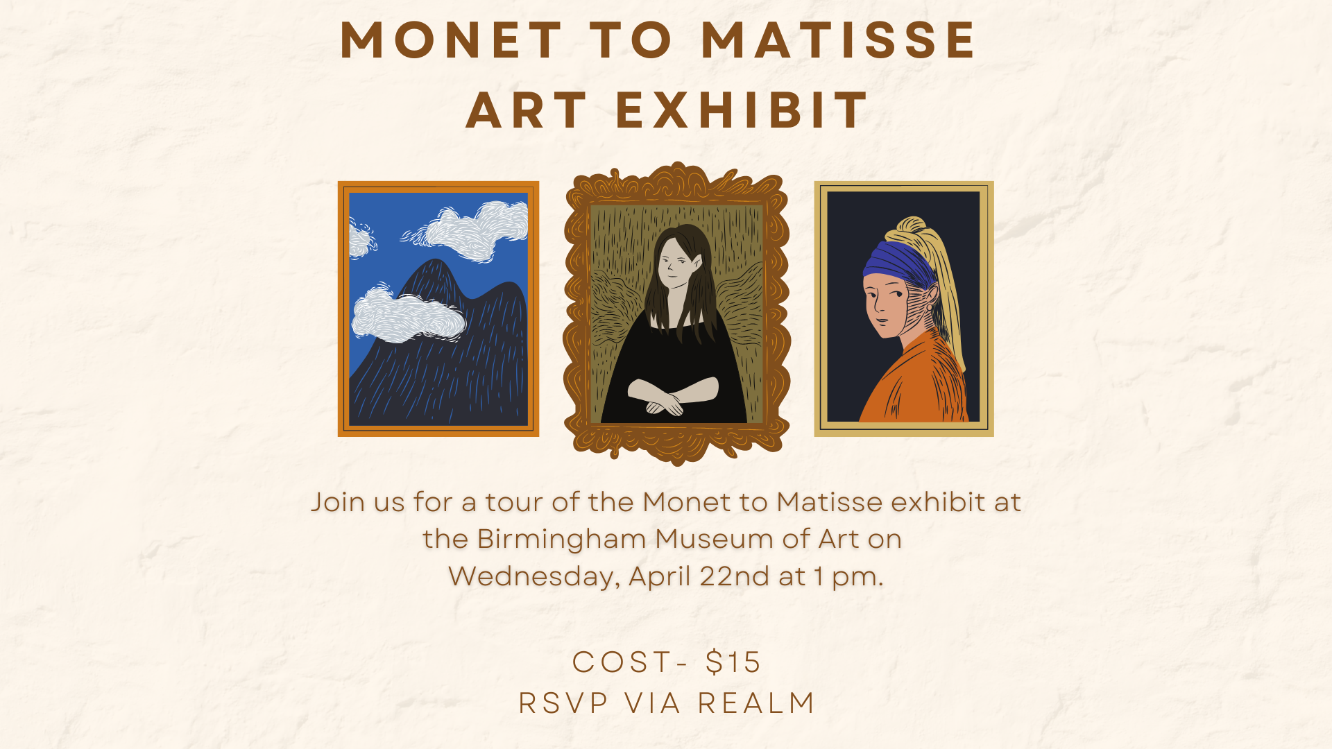 Join us for a tour of the Monet to Matisse exhibit at the Birmingham Museum of Art on Wednesday, April 22 at 1 pm. Tickets are $15, payable to Church of the Ascension. For questions, contact Kathy Lounsbury at kathy.lounsbury@ascensionepiscopal.org or 205-516-9521.