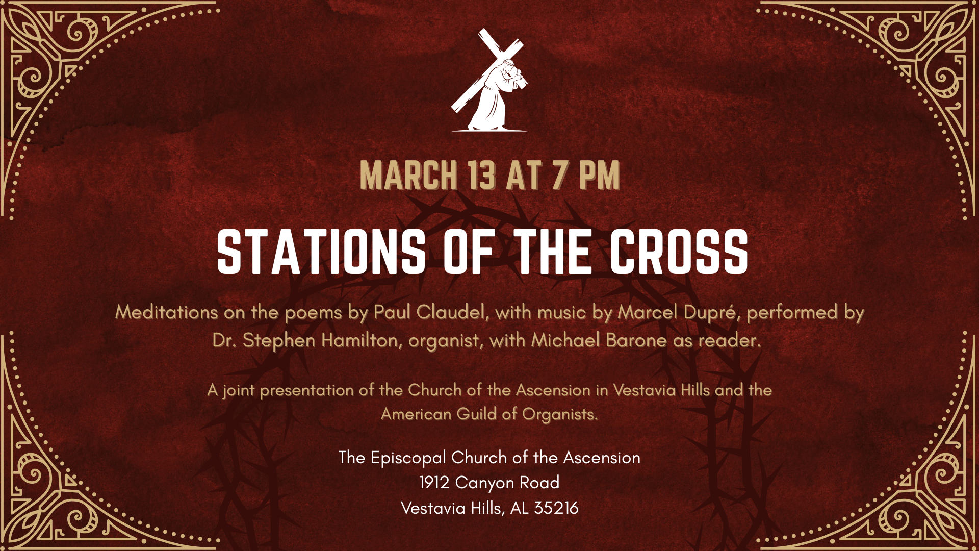 On Friday, March 13 at 7:00 pm, join us for Stations of the Cross, featuring meditations on the poems of Paul Claudel with music by Marcel Dupré. Dr. Stephen Hamilton will serve as organist, with American Public Media announcer Michael Barone as reader. This presentation is a joint offering of the Church of the Ascension and the American Guild of Organists, funded in part by generous donations to the Special Music Fund.