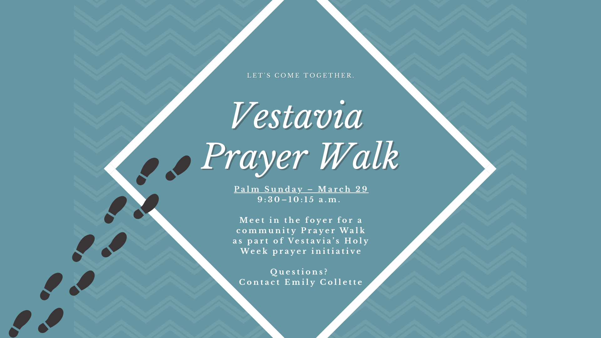 On Palm Sunday, March 29th, members are invited to join us for a prayer walk during the Sunday school hour (9:30-10:15 a.m.). We will meet in the foyer and walk to three shopping centers along HWY 31, as well as the apartments behind the church. We will offer prayers for the people who live and work in these spaces. This is part of an initiative by the city of Vestavia to cover the community in prayer during Holy Week. If you have any questions, please reach out to Emily Collette. (emily.collette@ascensionepiscopal.org)